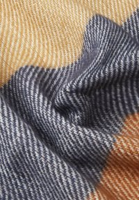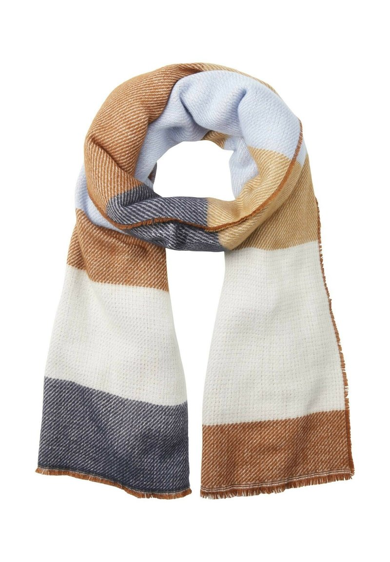 Écharpe douce en tissu tissé avec de larges rayures horizontales marron, bleu clair, marine, beige et blanc, pliée en boucle avec des bords frangés.