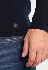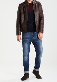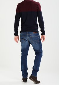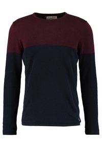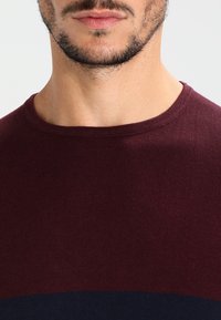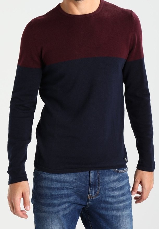 Homme portant un pull multicolore à manches longues avec un haut bordeaux et un bas marine, associé à un jean bleu, debout devant un fond uni.