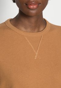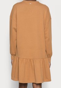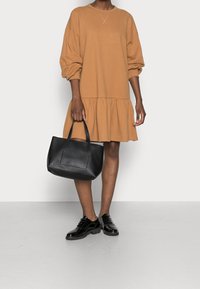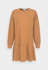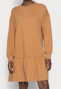 Robe ample à manches longues couleur beige camel avec ourlet froncé et poignets côtelés portée par une personne sur un fond uni.