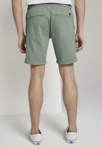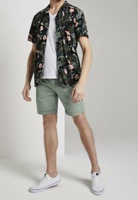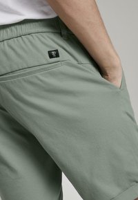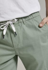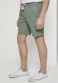 Homme portant un short à cordon de serrage vert clair et des baskets blanches, se tenant devant un fond clair.