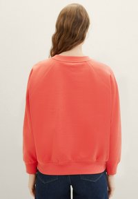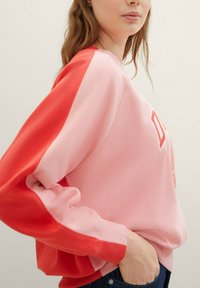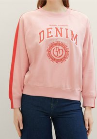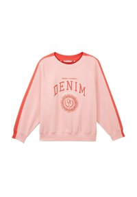 Sweat-shirt rose avec des bandes latérales rouges. Présente un texte graphique "DENIM" et un logo. Tissu doux, coupe décontractée, poignets et ourlet côtelés.