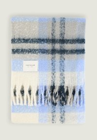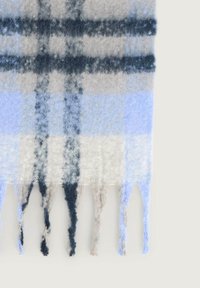 Écharpe tissée douce à motif écossais bleu, noir, beige et blanc avec des extrémités à franges, pliée en une boucle lâche.