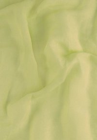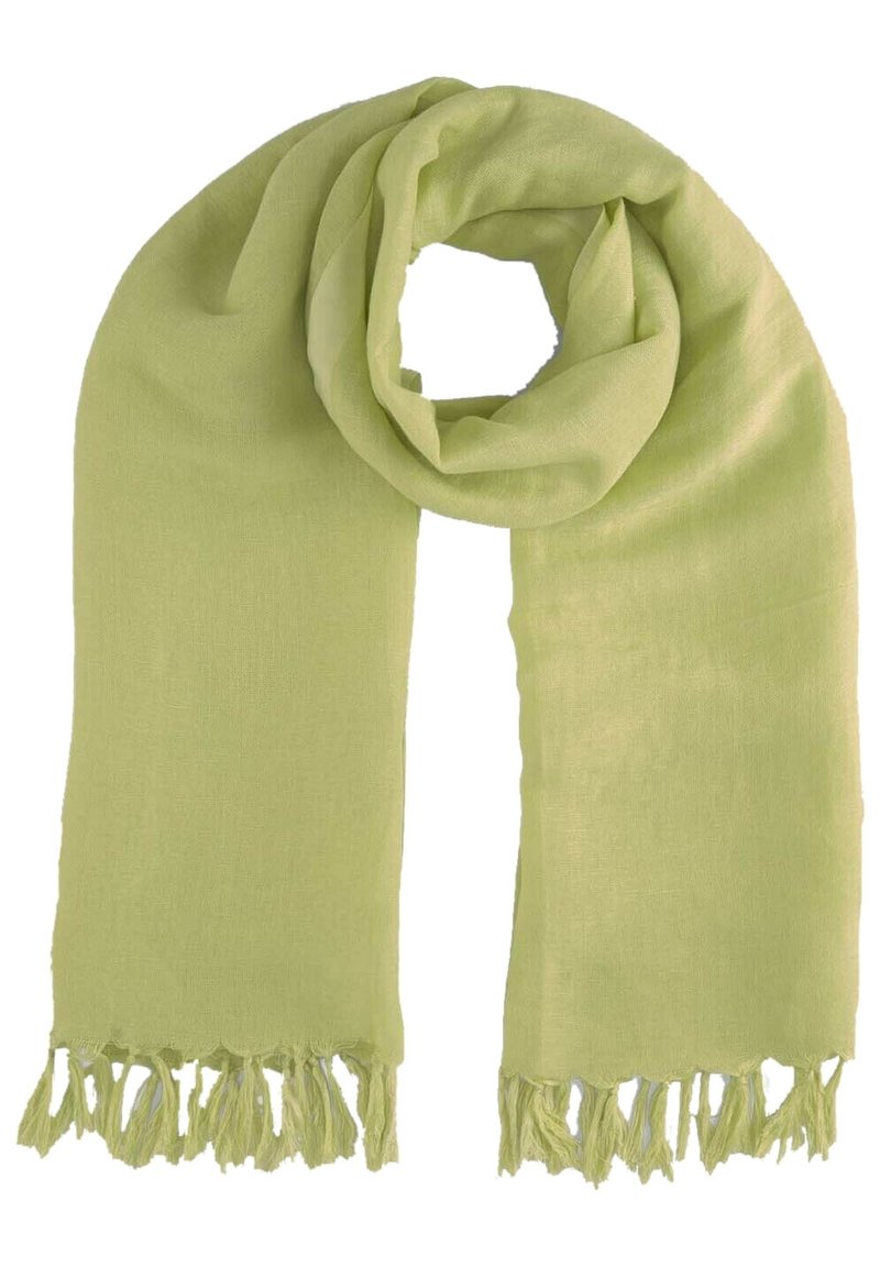 Écharpe vert clair en tissu doux, bouclée lâchement, avec des franges aux extrémités des deux côtés.