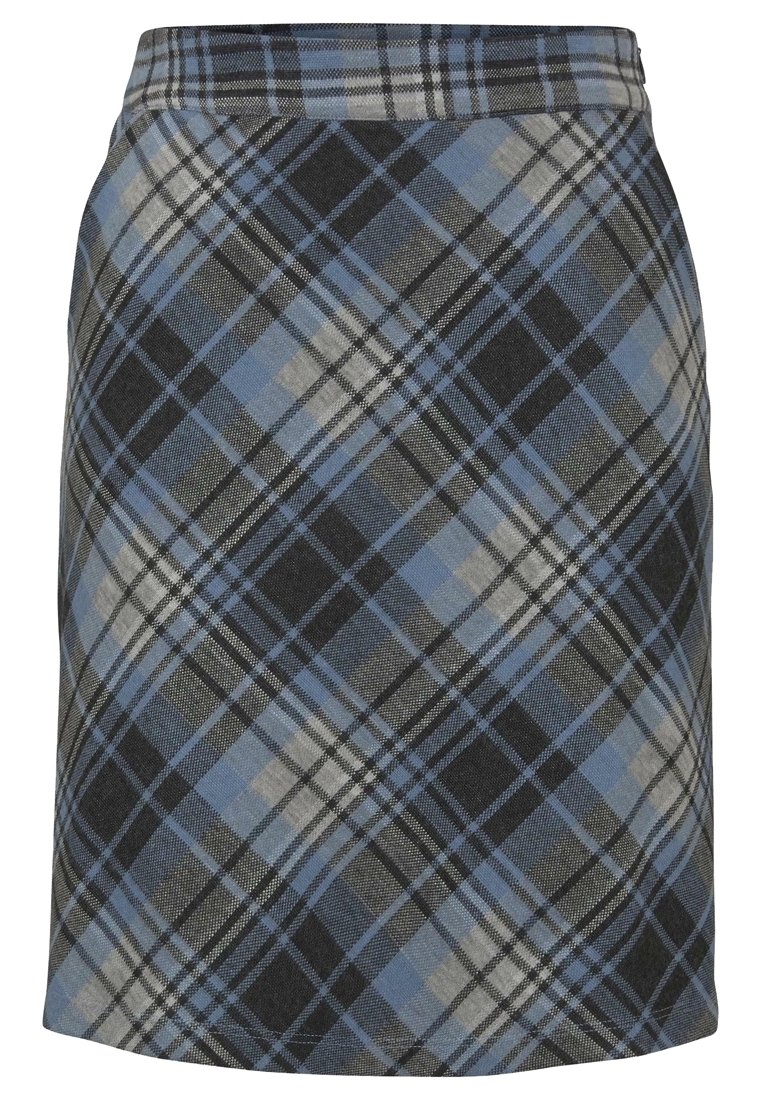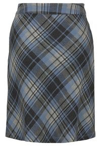 Jupe à carreaux dans des tons de bleu, gris et noir. Fabriquée dans un tissu texturé avec une taille ajustée et une coupe longueur genou. Présente un motif écossais classique.