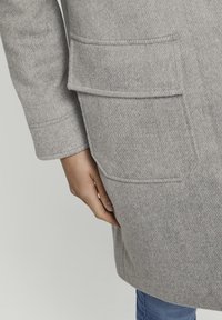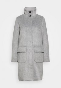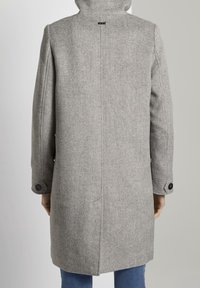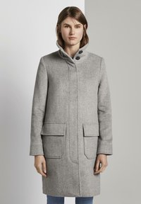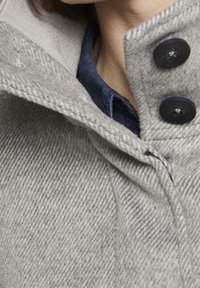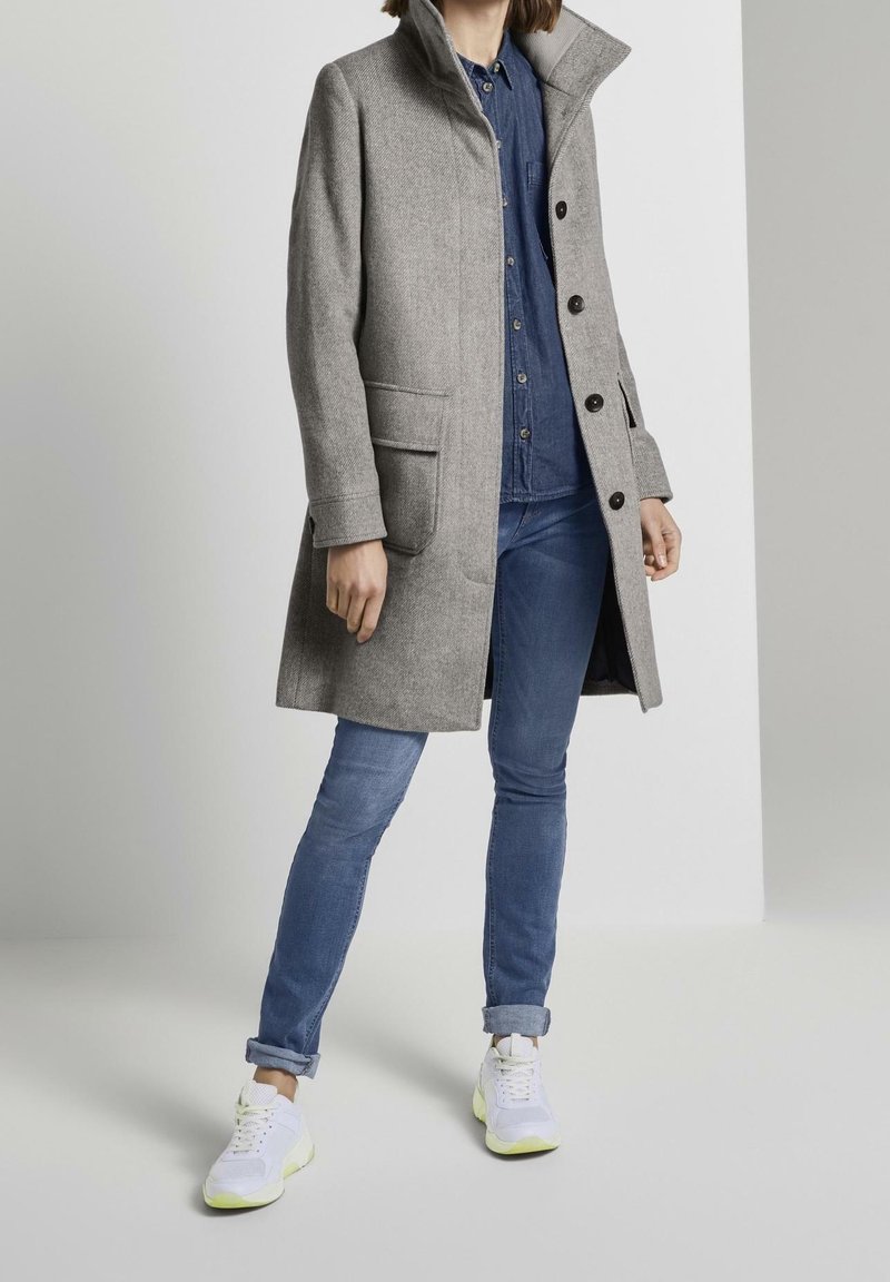 Manteau en mélange de laine gris avec un col montant, une fermeture à boutons sur le devant et deux poches latérales. Porté sur une chemise en denim et un jean bleu, avec des baskets blanches.