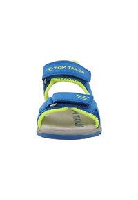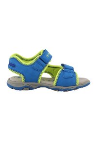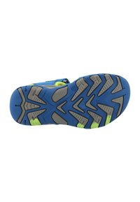 Sandales bleues et vertes avec un motif de ballon de football, brides réglables, semelle intérieure texturée et semelle en caoutchouc durable pour une meilleure adhérence.