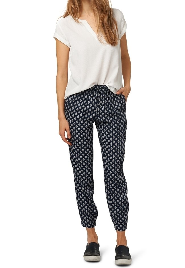 Haut blanc à manches courtes associé à un pantalon motif marine avec taille à cordon et jambes fuselées. Des chaussures sombres viennent compléter l'ensemble.
