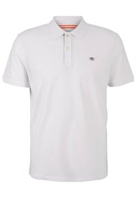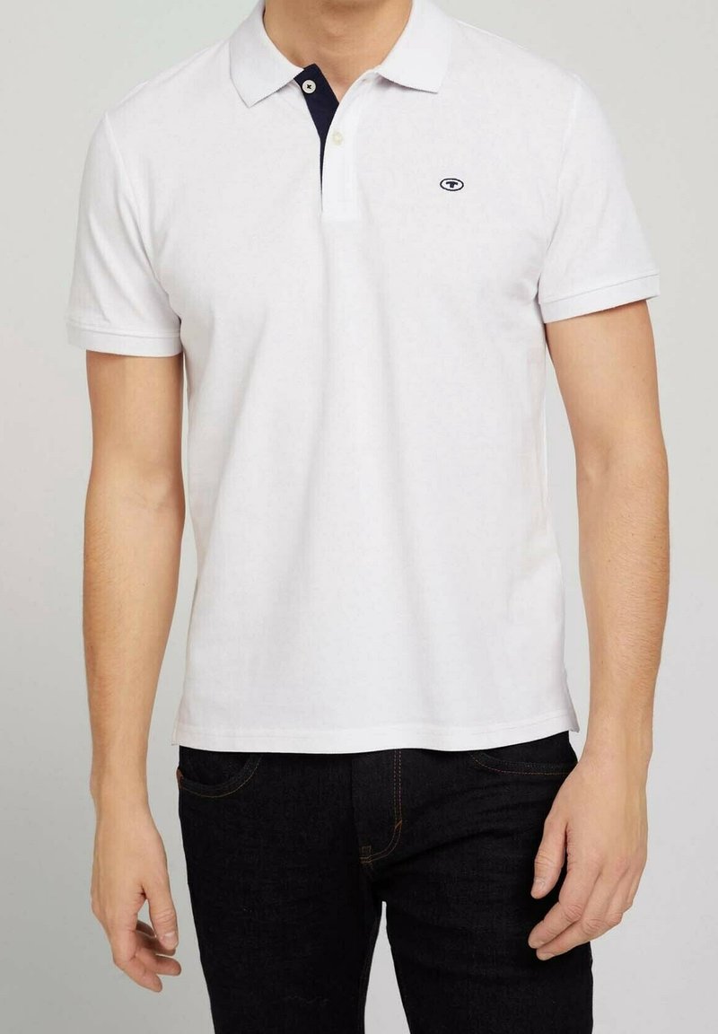 Polo-shirt blanc avec un col marine et une patte de boutonnage à deux boutons, fabriqué en coton respirant, avec un petit logo brodé sur la poitrine.