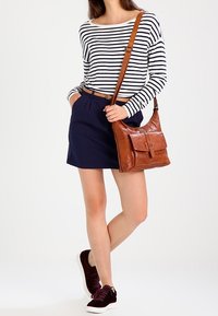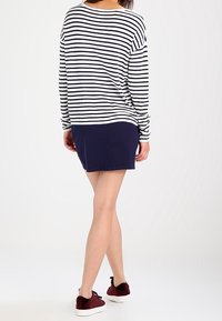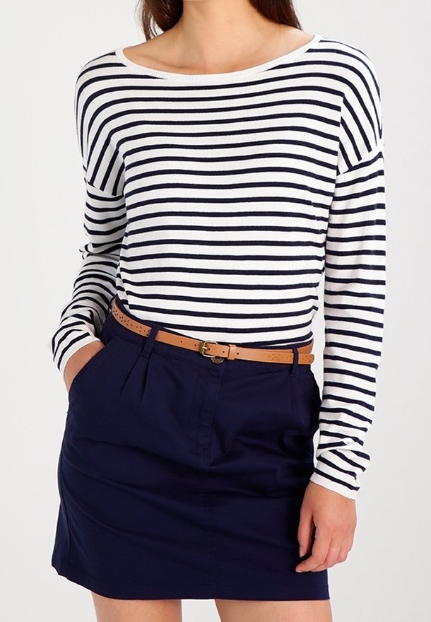 Haut à manches longues rayé blanc et marine, associé à une jupe marine et une ceinture en cuir marron. Le tissu semble doux avec une coupe décontractée.