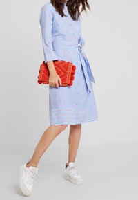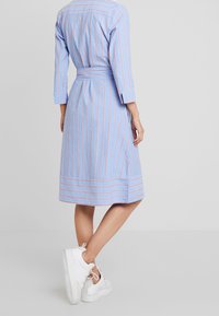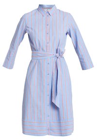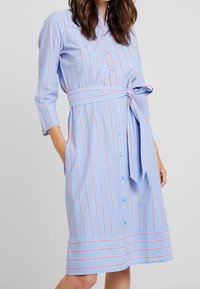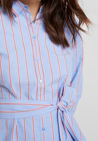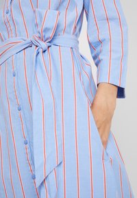 Femme portant une robe-chemise bleu clair à rayures verticales rouges, manches trois-quarts, boutons à l'avant et ceinture nouée à la taille.