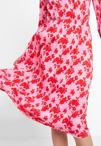 Robe rose à motif floral rouge, manches longues, encolure froncée et taille cintrée. Portée avec des sandales à talons beiges.