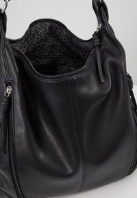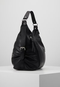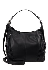 Sac d'épaule en cuir noir avec deux poches avant à fermeture éclair, une poignée courbée et une bandoulière réglable, présenté sur une surface blanche.