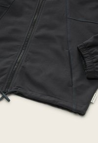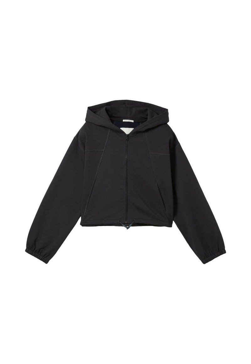 Haut à capuche noir coupé, avec des manches longues, fermeture éclair à l'avant, ourlet à cordon de serrage et deux poches latérales. Tissu lisse avec des détails de couture visibles.