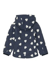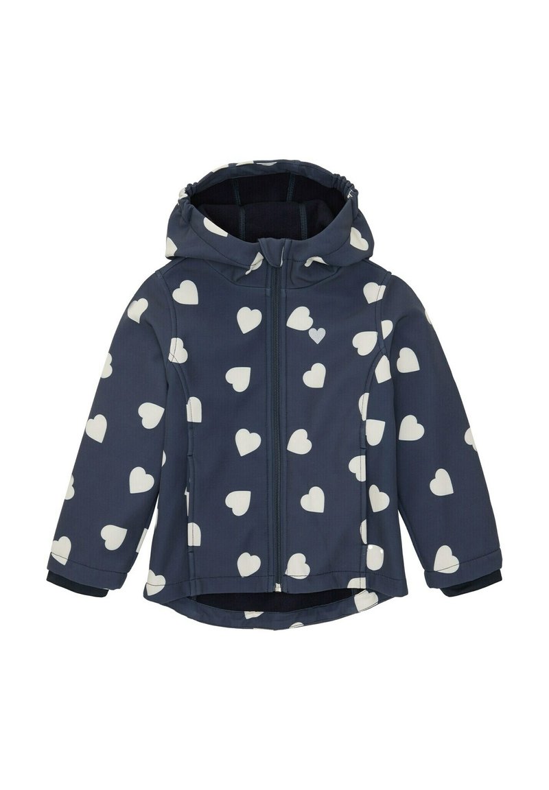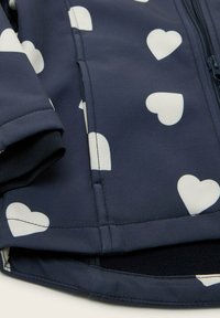 Veste à capuche pour enfants bleu marine avec motifs de cœurs blancs, fermeture éclair à l'avant et poignets élastiqués.