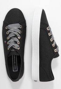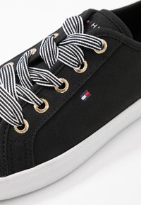 Baskets en toile noire avec semelles en caoutchouc blanches, ornées d'œillets dorés et de lacets rayés. Un logo brodé est visible sur le côté.