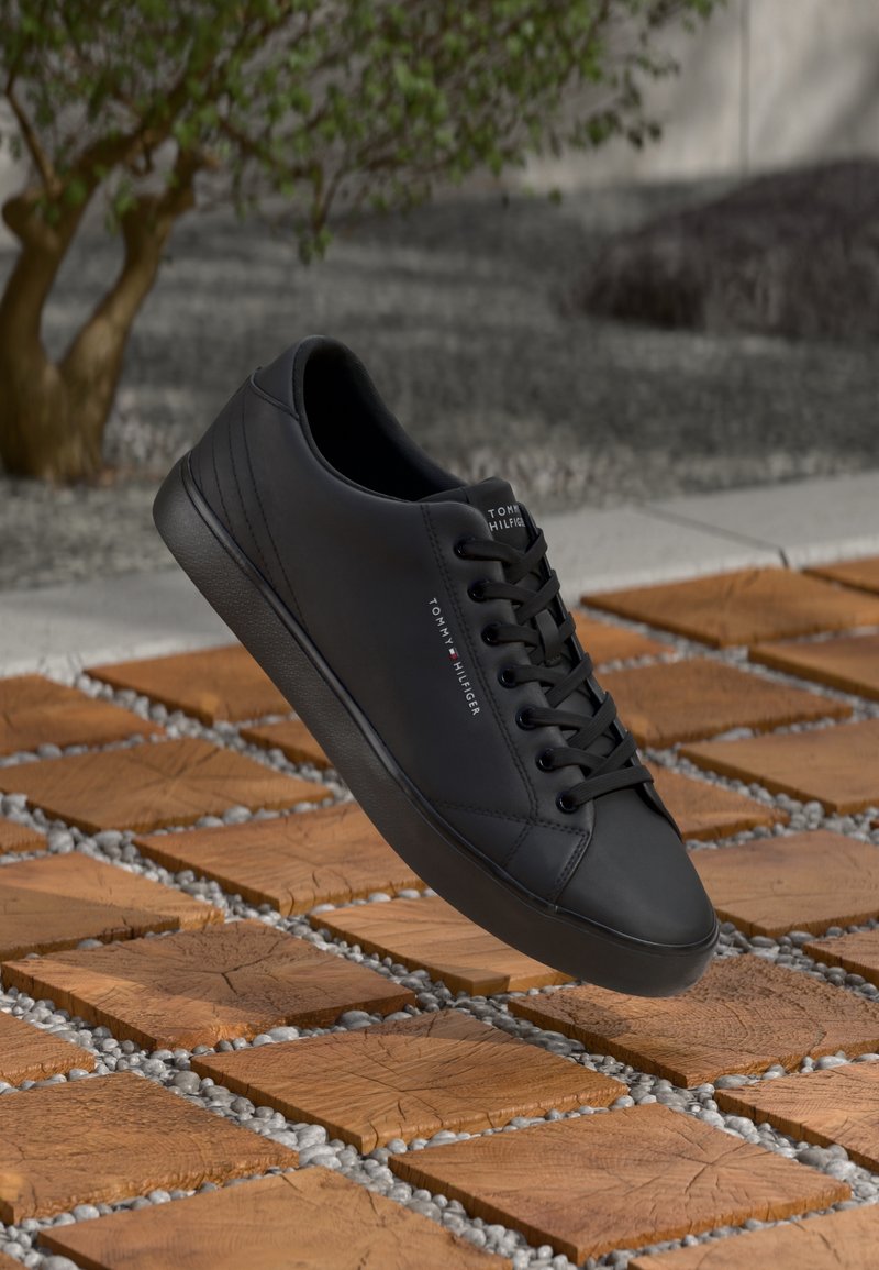 Baskets basses noires avec lacets noirs et logo "Tommy Hilfiger", flottant au-dessus d'un bloc en bois et d'un sol à motif de galets.