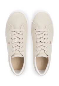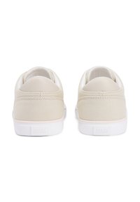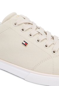 Baskets basses en toile beige avec semelle blanche, fermeture à lacets, et petit logo rouge, blanc et bleu sur le côté.