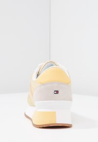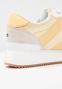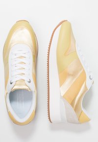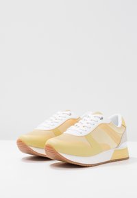 Baskets avec dessus synthétique jaune et blanc, accents métalliques et lacets blancs. Comprend une semelle surélevée et une semelle extérieure en caoutchouc texturé.
