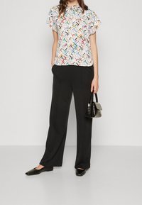 Femme portant un chemisier blanc à imprimé zèbre orange avec des manches courtes bouffantes, associé à un pantalon noir taille haute.