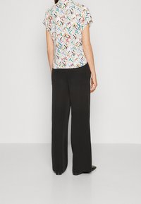 Blouse à manches longues avec col en V, ornée d'un motif abstrait de lettres rouges et roses, rentrée dans un pantalon noir taille haute avec une ceinture large nouée.