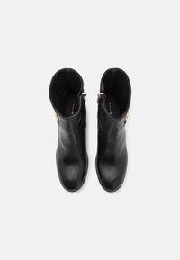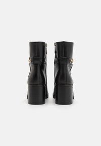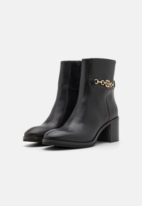 Botte cheville en cuir noir avec bout carré, talon épais et détail chaîne dorée autour de la cheville. Texture lisse et accents de design minimalistes.