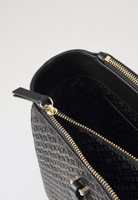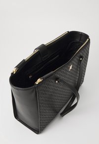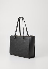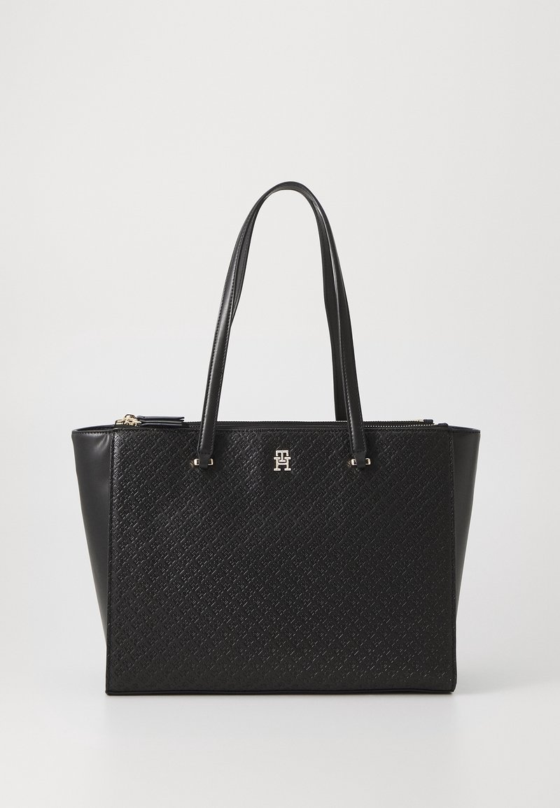 Sac fourre-tout noir avec un devant texturé, des côtés en cuir lisse, deux poignées et un accent logo doré. Dispose d'une fermeture éclair.