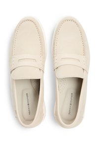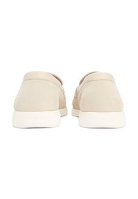 Mocassin en cuir beige à enfiler avec semelle blanche, bout mocassin cousu et petit détail de logo sur le côté, présenté en vue de profil.