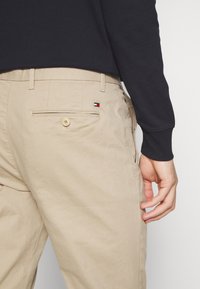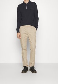Homme portant un pantalon beige à jambes droites, des chaussures noires à lacets et un haut noir à manches longues, debout avec une main dans la poche.