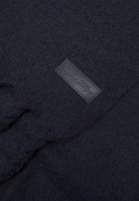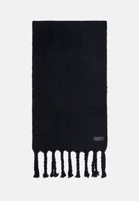 Écharpe noire tissée avec des franges torsadées en bas. Texture douce et forme rectangulaire, avec une petite étiquette en cuir sur un bord.