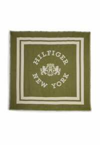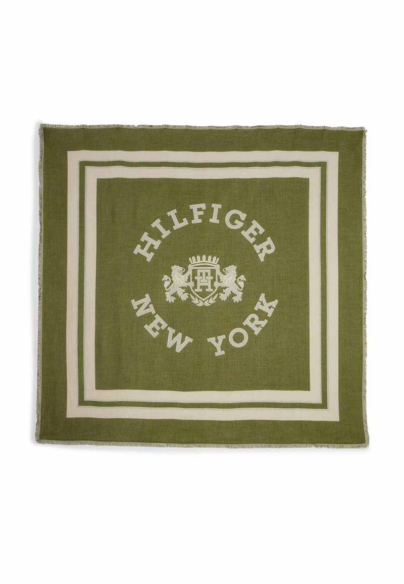 Foulard carré vert olive aux bords crème et écusson central avec deux lions et le texte « Hilfiger New York » en cercle.