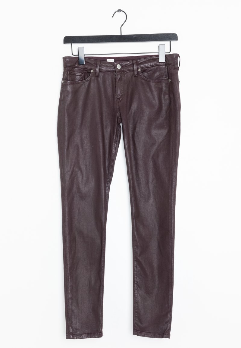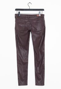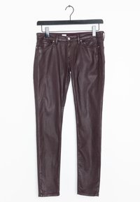 Jean slim-fit bordeaux en denim, doté de cinq poches, d'un bouton en métal et d'une fermeture éclair, avec un léger brillant sur le tissu.