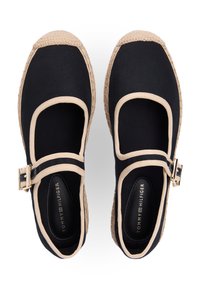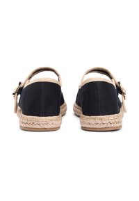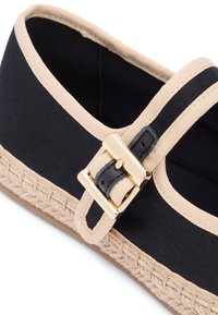 Chaussure plate Mary Jane en toile noire avec bordure beige, semelle en jute tressée et bride à boucle dorée sur fond blanc.