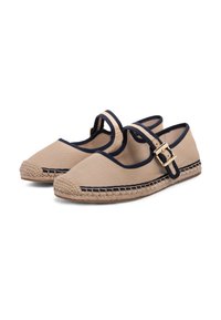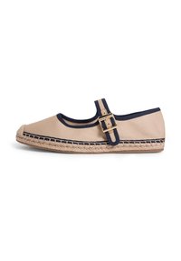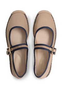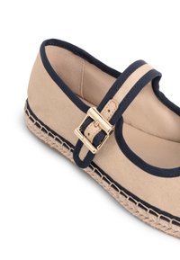 Chaussure plate en toile beige avec bordure marine, semelle en jute tressé, et bride marine ajustable avec boucle dorée sur le dessus.