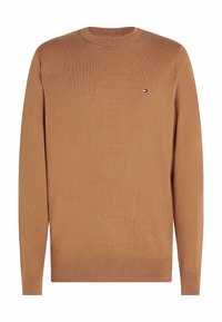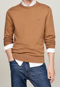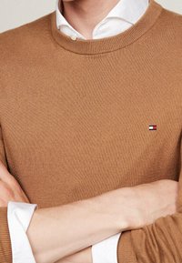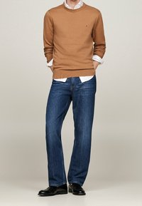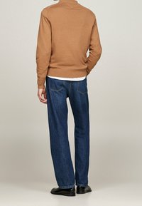 Homme portant un pull camel par-dessus une chemise blanche aux manches retroussées, associé à un jean bleu foncé, main dans la poche.