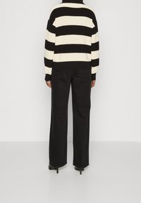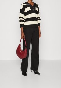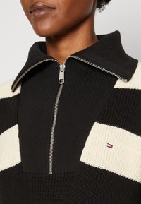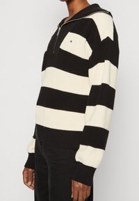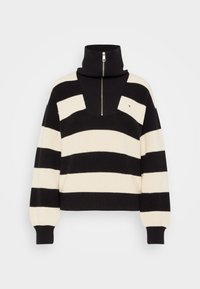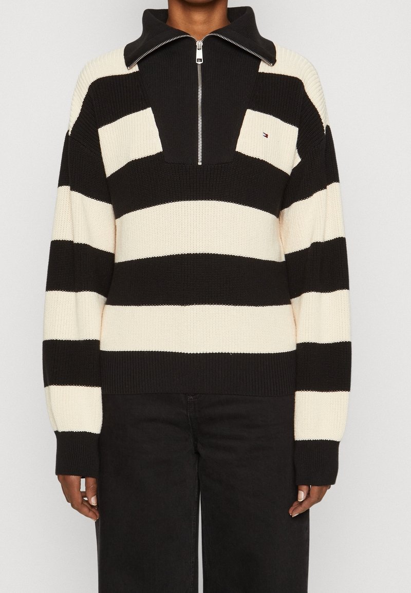 Pull en tricot rayé noir et crème avec un large col, une fermeture à glissière à moitié devant, et des poignets et ourlet côtelés. Détail du logo sur la poitrine.
