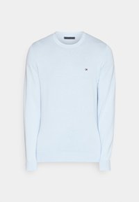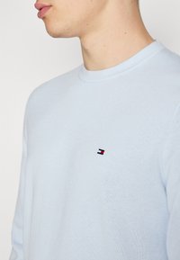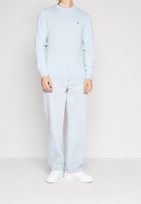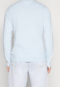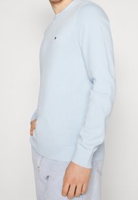 Pull bleu clair en maille avec col rond, manches longues, poignets et ourlet côtelés, arborant un petit logo brodé sur la poitrine.