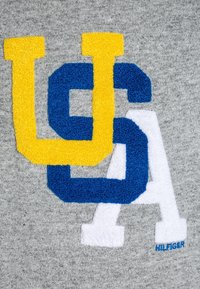 Sweatshirt gris avec un logo "USA" texturé multicolore en jaune, bleu et blanc. Présence de détails côtelés aux poignets et au col.