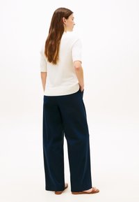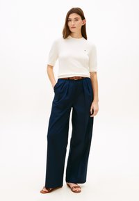 Femme portant un haut blanc à manches courtes avec un petit logo, un pantalon plissé bleu marine et une ceinture marron, debout avec une main dans la poche.