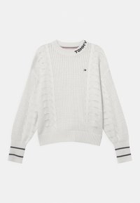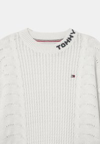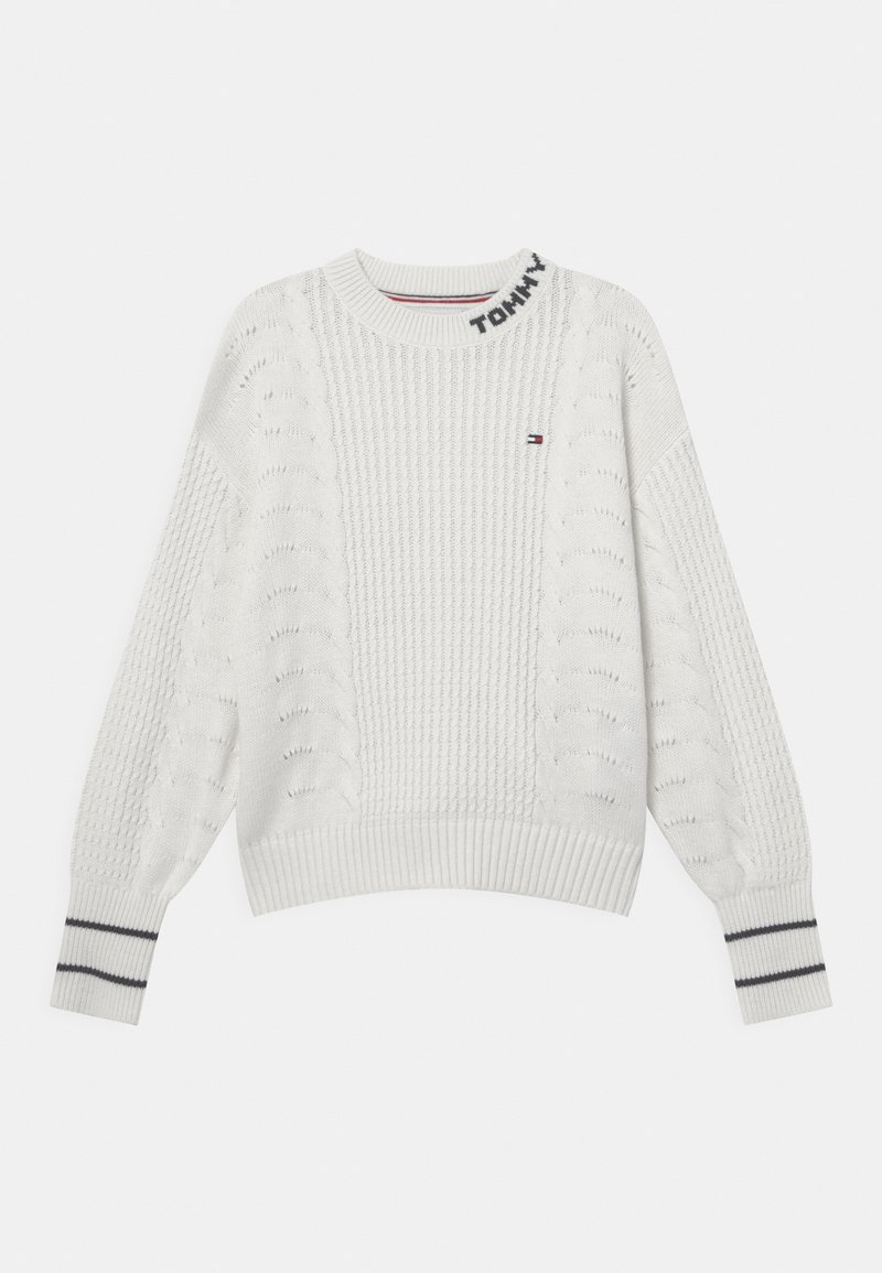 Pull en tricot blanc avec des motifs de tresses, poignets et encolure côtelés. Présente des accents de rayures bleu et rouge avec "TOMMY" brodé sur le col.