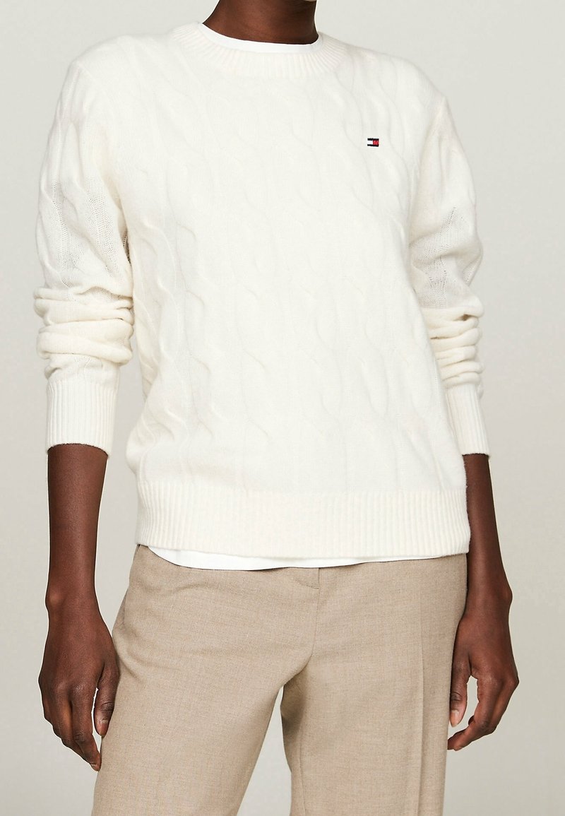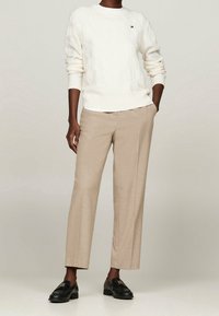 Personne portant un pull en maille blanche avec un petit logo sur la poitrine et un pantalon beige, se tenant devant un fond uni.