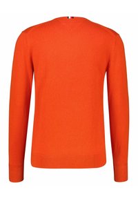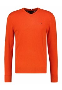 Pull orange à col en V en tissu tricoté, avec manches longues et ourlet côtelé. Petit détail de logo sur la poitrine. Texture uniforme sur toute la surface.