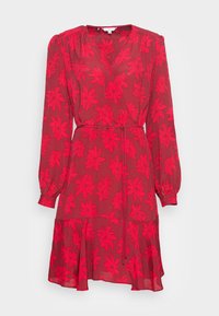 Robe fleurie rose avec un col en V, des manches longues ballon, une taille froncée et une jupe à volants. Présente de grandes fleurs blanches et bordeaux sur un tissu doux.