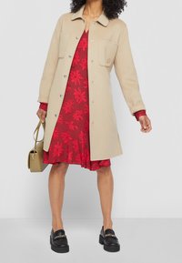 Manteau beige avec des boutons-pression, superposé sur une robe fleurie rouge. Ajoute un sac bandoulière vert et des mocassins noirs épais avec des accents métalliques.