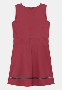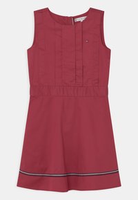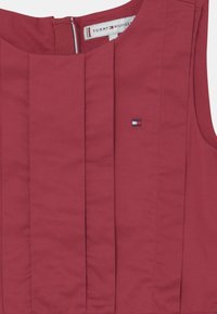 Robe sans manches en tissu rouge foncé avec des plis verticaux et une couture à la taille. Elle présente une bande contrastante à l'ourlet. Fermeture zippée au dos.