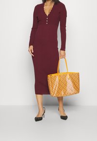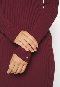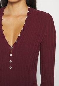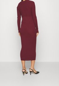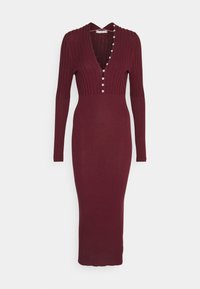 Robe côtelée bordeaux avec un col en V et des manches longues. Dotée d'une rangée de boutons le long de l'encolure. Coupe ajustée, longueur mi-mollet, texture douce.