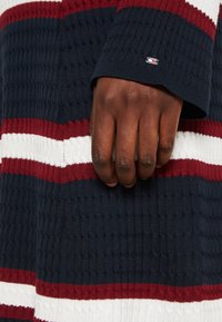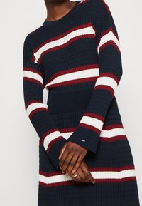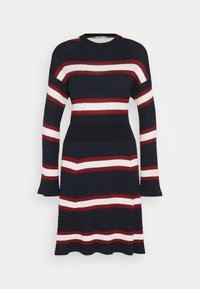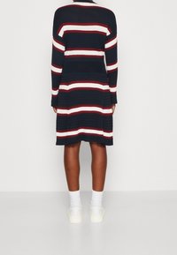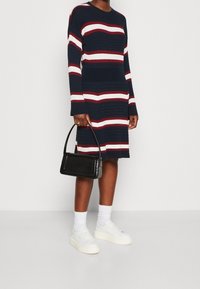 Personne portant une robe en maille bleu marine avec des rayures horizontales blanches et bordeaux, des chaussettes blanches et des baskets blanches, debout sur un fond uni.