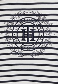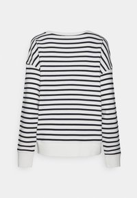 Sweatshirt à rayures en blanc et bleu marine, avec un graphique de logo au centre, des poignets côtelés et une coupe décontractée. Matière en coton doux.