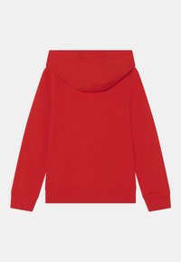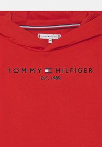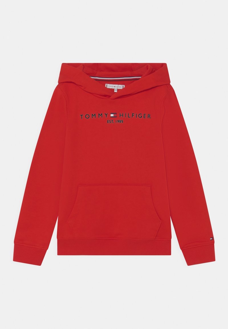 Hoodie rouge avec une poche frontale, capuche à cordon, et logo "TOMMY HILFIGER EST. 1985" en noir sur la poitrine. Manches et ourlet côtelés.