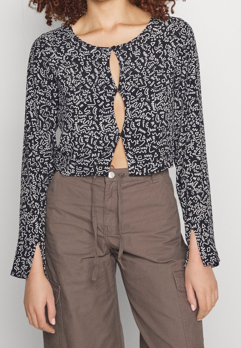 Top court à motifs noir et blanc avec des manches longues, présentant un détail en forme de trou de serrure à l'avant et des fentes sur les manches.