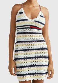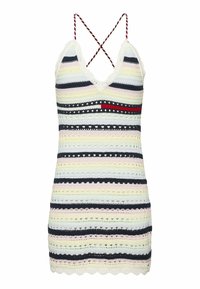 Robe en crochet avec des rayures multicolores en bleu, jaune et rose. Elle présente un ourlet festonné, un décolleté en V profond et des bretelles fines et ajustables.